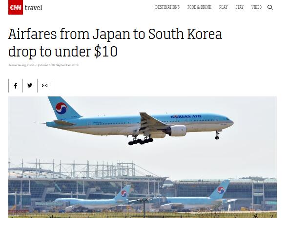 [环球网报道 记者 温家越]日韩贸易摩擦升级,两国紧张关系不断升级,影响也辐射至旅游业。美国有线电视新闻网(CNN)9月10日报道称,近期从韩国飞往日本的机票价格竟低至10美元以下。
