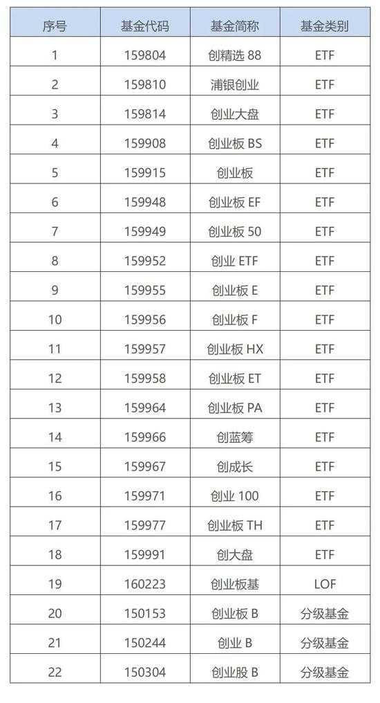 根据深交所公布的名单,创业板精选88等这22只基金将随之调整,大部分为ETF。