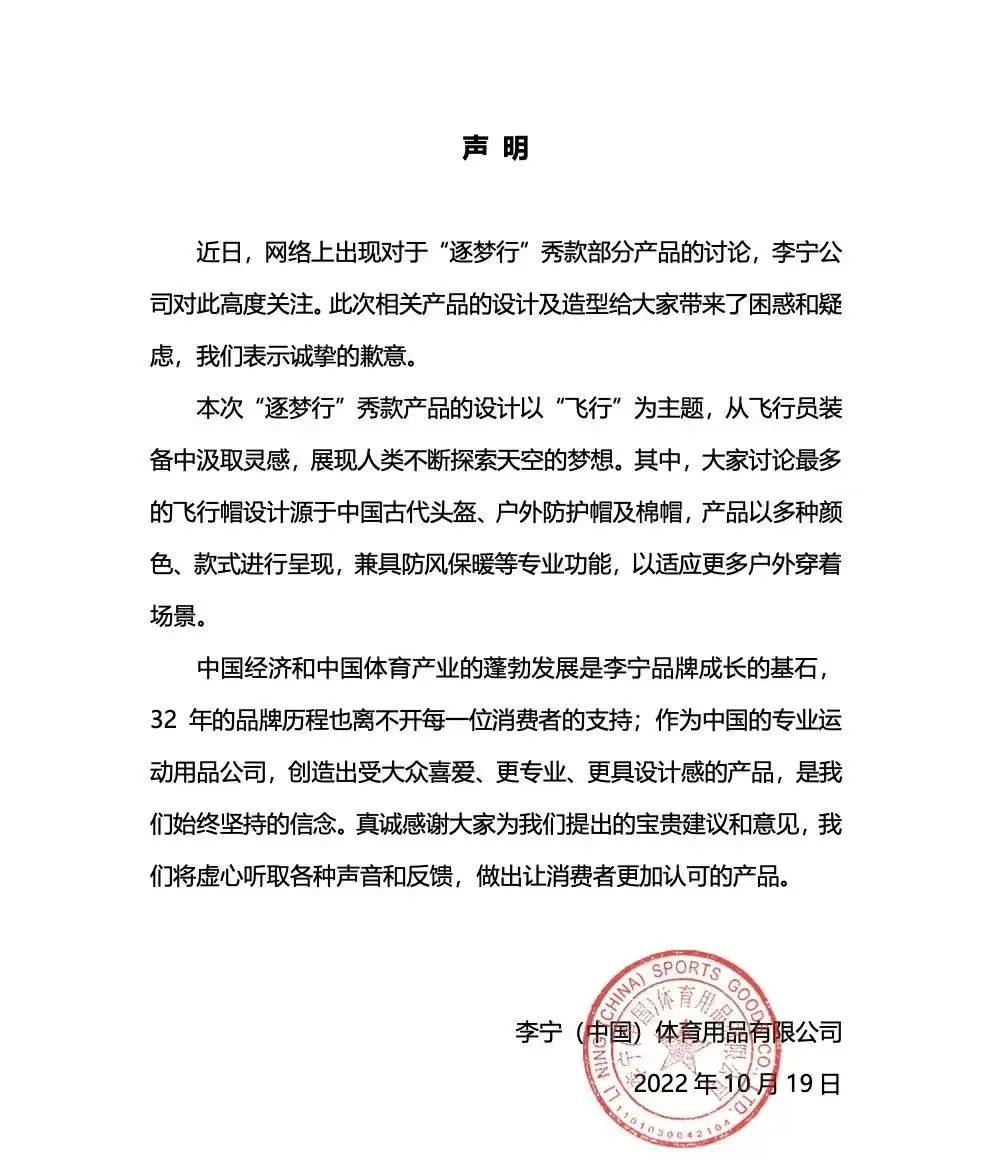 或是看到了消费者的态度,10月19日,李宁方面通过官方微博发布了声明进一步解释道,该次“逐梦行”秀款产品的设计以“飞行”为主题,从飞行员装备中汲取灵感,展现人类不断探索天空的梦想。其中,大家讨论最多的飞行帽设计源于中国古代头盔、户外防护帽及棉帽,产品以多种颜色、款式进行呈现,兼具防风保暖等专业功能,以适应更多户外穿着场景。