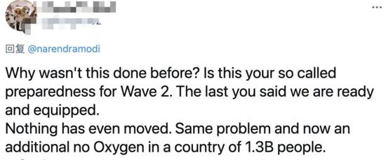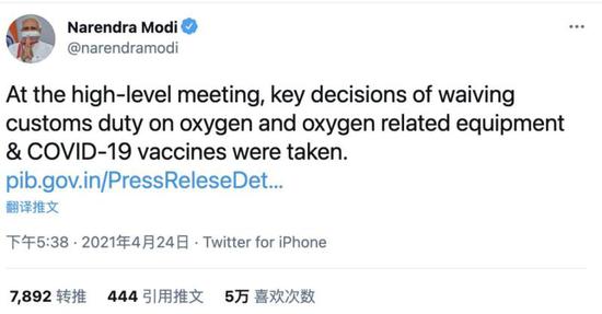记者注意到,针对医用氧气极度短缺的局面,当地时间4月24日,印度总理莫迪通过社交网络发声,政府已经做出了免除进口氧气、氧气相关设备及进口疫苗关税的决定。