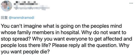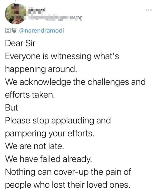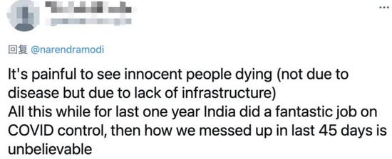 “看到无辜的人死亡很痛苦(不是由于疾病,而是由于缺乏基础设施)。在过去的一年中,印度在控制疫情方面做得非常出色,而在过去45天里,我们的混乱情况令人难以置信。”