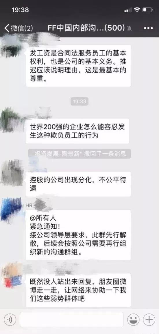 以下为媒体报道中的截图,截图显示,在“FF中国内部沟通某某500人的大群”中,员工们纷纷表示:“发工资是合同法服务员工的基本权利,也是公司的基本义务”;“世界200强的企业怎么能容忍发生这种欺负员工的行为”;“控股的公司出现分化,不公平待遇”。随后群主——公司HR更是表示:“接领导层要求,此群先行解散,后续根据公司组织需要再行组织新的沟通群组”。
